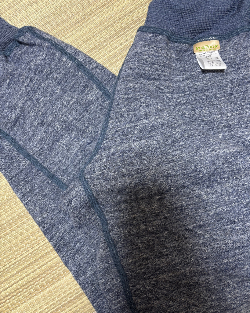 まずはこのピーポッドのルームウェア、私にとっては念願のお品でありまして、少し経緯を説明させてください。遡ること2023年6月、ピーポッドと出会いその当時は価格だけを見て高価すぎるルームウェアに対し、自分には縁がないと思っていました。(その時はレッグウォーマーを購入)