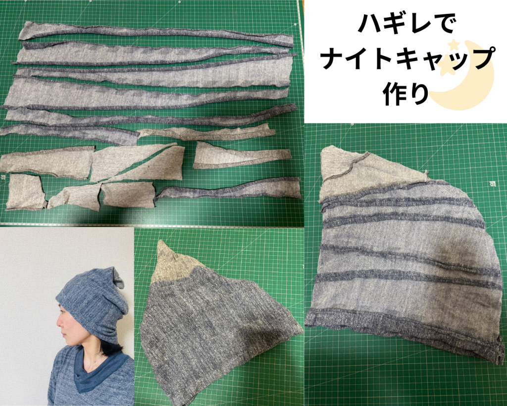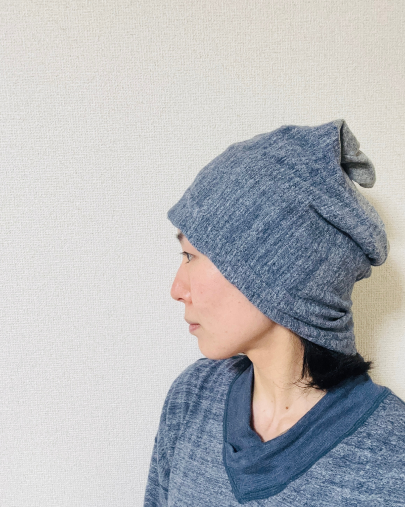 最後に余談ですが、就寝時に頭が寒かったのでルームウェアのハギレをつなぎ合わせて「ナイトキャップ」を作ってみました。”型紙無しの寸法無視”で適当にミシンでつなげただけなのですが、悩みは解決。暖かくて気持ちよく入眠できるようになりました。やっぱりこの生地がいいんですかね。気に入っています♪